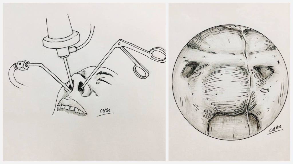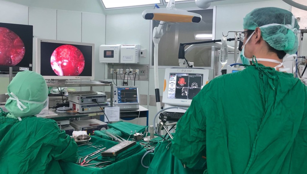 2.2 การผ่าตัดผ่านกล้องเอนโดสโคป (endoscope) นับเป็นวิธีการผ่าตัดที่เป็นที่นิยมมากขึ้นเรื่อยๆในปัจจุบันและเป็นการผ่าตัดที่หมอใช้ผ่าตัดเป็นหลัก โดยเป็นการใช้กล้องที่มีลักษณะเป็นท่อเล็กยาวและมีเลนส์อยู่ตรงส่วนปลาย ส่องเข้าไปในรูจมูกให้เห็นบริเวณที่ทำผ่าตัดโดยตรงและไม่ต้องลงแผลผ่าตัดภายนอก มุมมองที่ได้จากกล้อง endoscope นั้นจะมีลักษณะเป็นกว้าง (panoramic view) และมุมอับสายตาน้อยซึ่งเป็นข้อดีเมื่อเทียบกับกล้อง microscope อีกทั้งยังสามารถเปลี่ยนมุมมองได้ด้วยการใช้เลนส์ที่มีมุมมองต่างกันได้ (30,70 องศา) ดังนั้นการทำผ่าตัดด้วย endoscope จะทำให้แพทย์ผ่าตัดสามารถสำรวจว่ายังมีเนื้องอกหลงเหลืออยู่หรือไม่ โดยสามารถมองเห็นได้โดยตรง ประโยชน์ของ endoscope นั้นจะชัดเจนมากขึ้นในกรณีที่เนื้องอกมีขนาดใหญ่ซึ่งจะเกิดมุมอับสายตามากหากใช้การผ่าตัดด้วย microscope