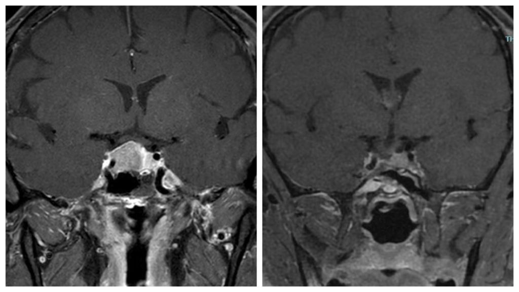 นอกจากผู้ป่วยรายนี้จะมีอายุน้อยและความดันโลหิตสูงมากแล้ว ยังพบว่ามีน้ำหนักเพิ่มขึ้นอย่างรวดเร็ว (50 ไปเป็น 67 กิโลกรัม)ร่วมกับมีลักษณะ “บวม” บริเวณกลางตัวซึ่งเป็นลักษณะเฉพาะที่ทำให้คิดถึง “โรคคุชชิง”(Cushing’s disease) เมื่อนำผู้ป่วยไปผ่านการตรวจทางห้องปฏิบัติการ (ซึ่งมีขั้นตอนมากมายดังที่หมอเคยกล่าวไปในตอนก่อนแล้ว) ก็ยืนยันว่าเป็นโรคนี้จริงร่วมกับการทำ MRI พบเนื้องอกต่อมใต้สมองที่เป็นสาเหตุดังภาพด้านล่าง