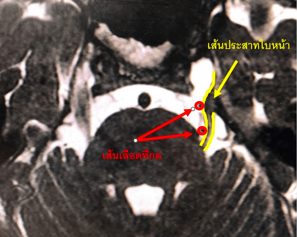 สำหรับผู้ป่วยรายนี้เมื่อให้คำแนะนำแล้ว คุณลุงถามต่อทันที “หนวกข้างเดียวใช่มั๊ยหมอ?” “ถ้าหายปวดได้ แม้หูหนวกข้างเดียวก็คุ้มมากครับหมอ” ทำให้หมอรับรู้ได้ทันทีว่าคุณลุงน่าจะทุกข์ทรมานจากอาการปวดมาก (คุณลุงแทบไม่สามารถใส่maskได้เลย เนื่องจากสัมผัสใบหน้าแล้วจะปวดมาก) การผ่าตัดผ่านไปด้วยดี หมอสามารถแยกเส้นเลือดต้นเหตุออกจากเส้นประสาทได้ หลังผ่าตัดคุณลุงหายปวดทันที (จากภาพจะเห็นรอยยิ้มร่วมกับmaskที่ใส่ได้โดยไม่ปวดแล้ว) รวมไปถึงการได้ยินก็เป็นปกติอีกด้วย